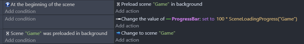 An action allows to change the default loading order by choosing which scene to pre-load in the background next. For instance, this action can be used at the beginning of the scene to make sure that the next level will be pre-loaded as soon as possible.