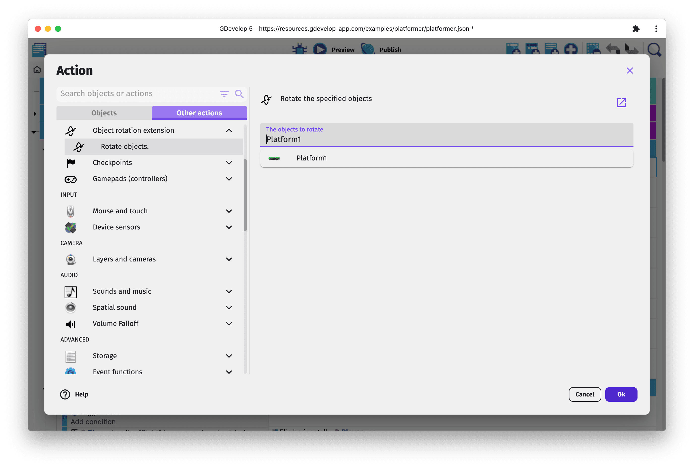 Similarly to scenes or external events, functions are written with events. They allow to create new conditions, new actions and new expressions that add up to GDevelop features. They are a good way to organize events, avoid duplication and share features with the community.