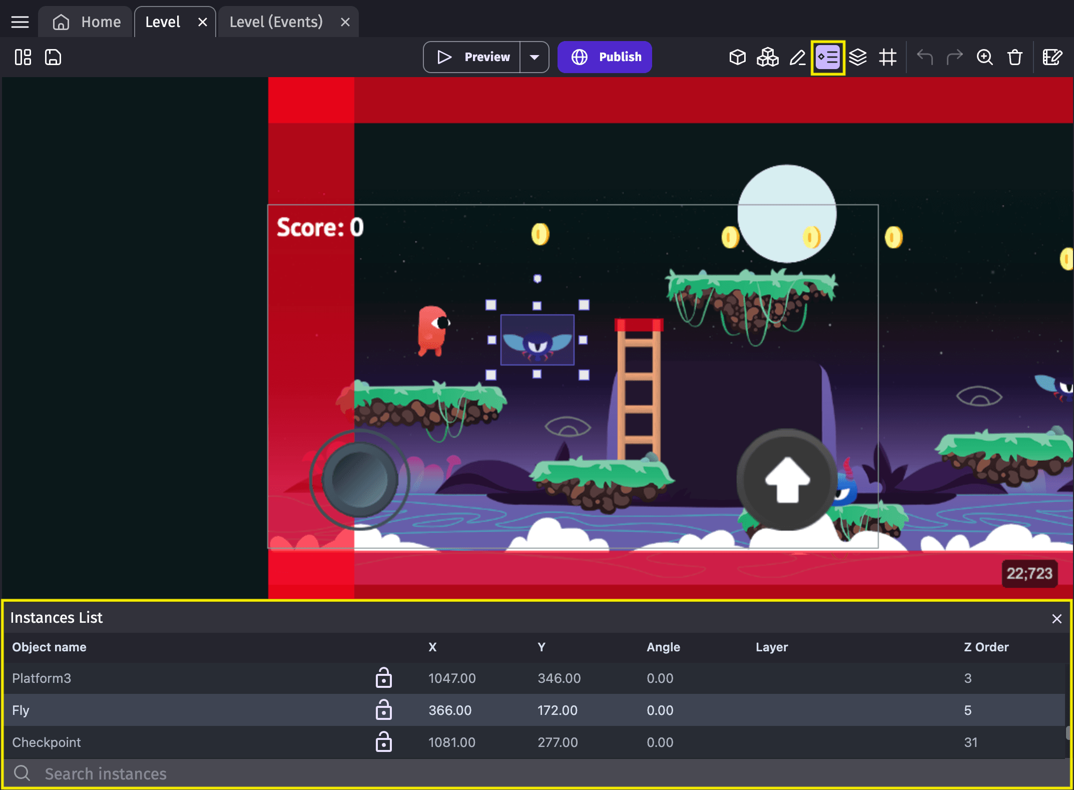 The instances panel displays the list of all of an object's instances living in the scene. It can be used to quickly select any instance. In the list, you can see the position, angle, layer and Z order in the scene of any instance.