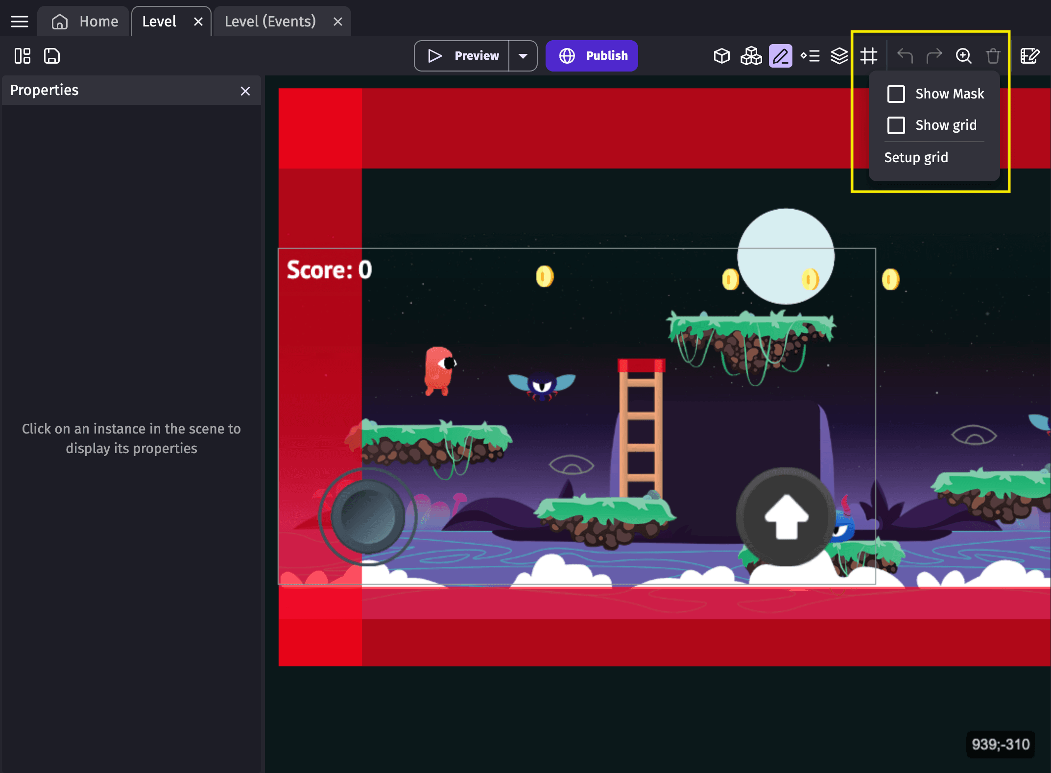 The Scene Editor is where you can design and build the game levels, menus, inventories, or any other screen in the game. The Scene Editor allows you to create and add objects to the scene. The gameplay and rules of the game can be created using events in the Events Editor.