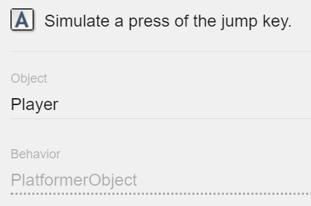 Click on OK to confirm and we will have our first Event condition. Next up, we need to "Add an action" that will take place if the condition is met. We want our character to jump when the specified condition is met. To add this action, search and click on Platform Behaviour->Control->Simulate jump keypress.