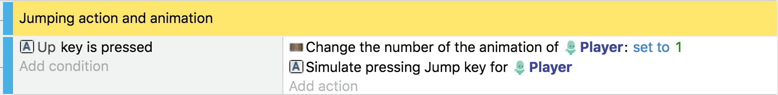 Note that the Object should be set to Player as we want the player to perform the action. Now we also want the jump animation to play while the Player Sprite jumps. To do this we add another action for the same event condition. Click on Add an action->Sprite->Animation and images->Change the animation and set it as shown. Note that instead of using identifier numbers, you can also use the animation name. To refer to animations using their name, you should use the Change the animation (by name) option instead. The name should be within quotes.