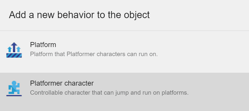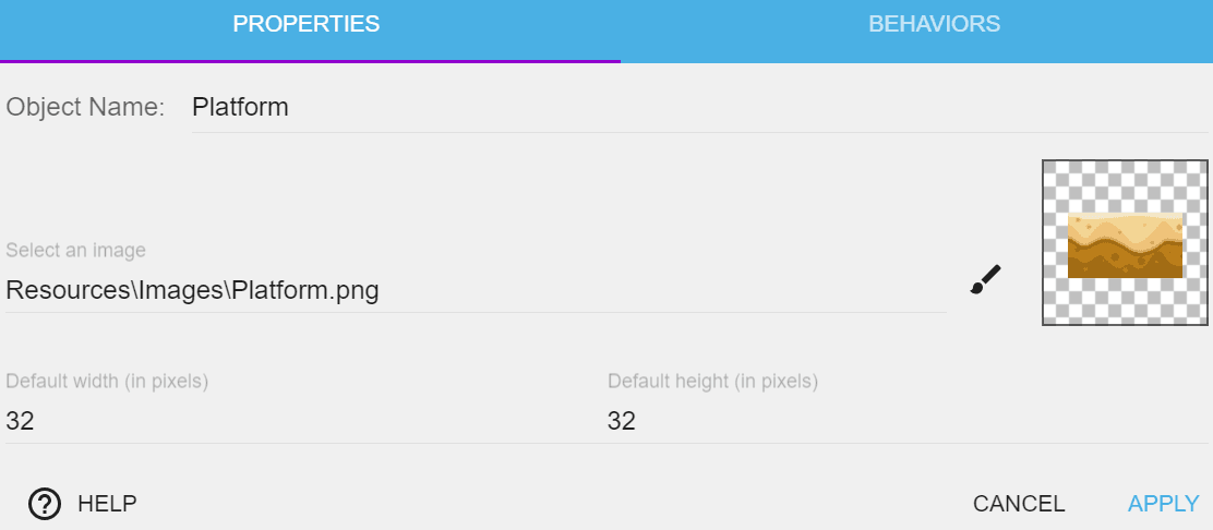 Notice that I have also changed the default object name to "Platform". Change your Default width to 193 and Default height to 40, for now. Now, we need to add a Behavior for this object, in a way similar to when we added behavior for our Player Sprite. Go to the Behaviors tab, click to add a behavior to the object and choose Platform type of behavior.