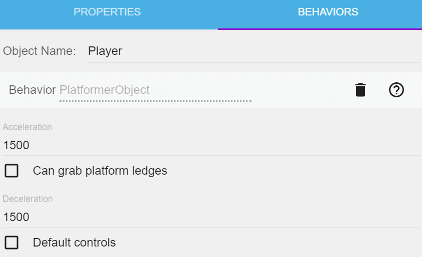 The behavior editor menu will open up. Here, make sure to uncheck the Default controls feature for this behavior. The default controls property adds all necessary movements for a platformer character including moving left, right and jumping. Since we don't want our character to move left or right, but only need the Jump action, we disable this property and create the Jump movement using events.