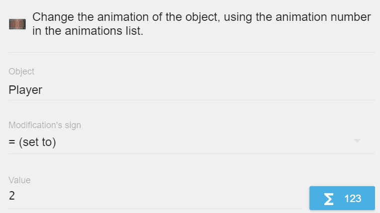 We also need to make the character play the Run animation when he is on floor. Since we have already made an event to check the "Is on floor" condition, we can simply add another action for this same event. Click Add an action->Sprites->Animation and images->Change the animation. Then fill in the object and the correct animation identifier to play that particular animation. For this game, we saved our Run animation at the identifier 2. You can also use the animation name as an identifier. To refer to animations using their name, you should use the Change the animation (by name) option instead. If you use a name, don't forget to put the name within quotes (") as it is a string.
