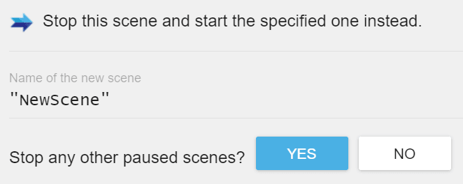 Next, we need to add an action to restart the game or scene. To do this, Add an action-> Scene-> Change the scene. Then specify the name of our scene within quotes. Select the Stop any other paused scenes option. This option is not necessary for our game since it only contains one scene, but it may be beneficial for increasing the performance for games having a large number of scenes.