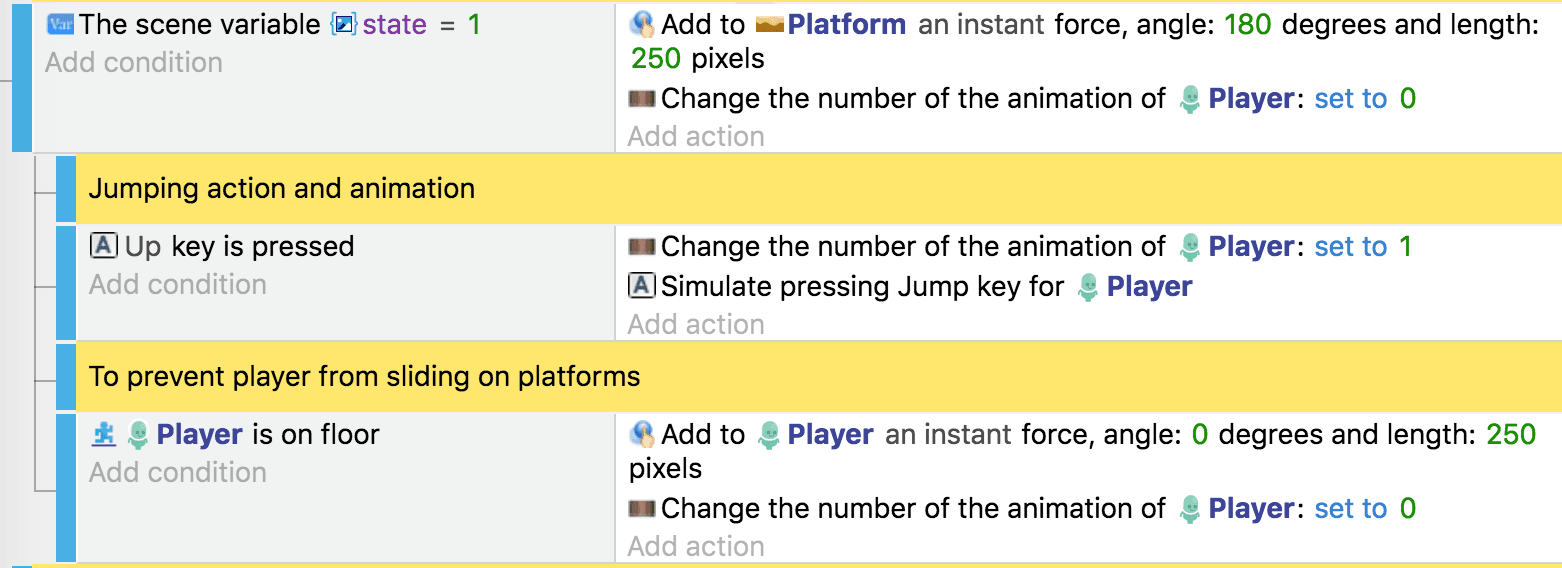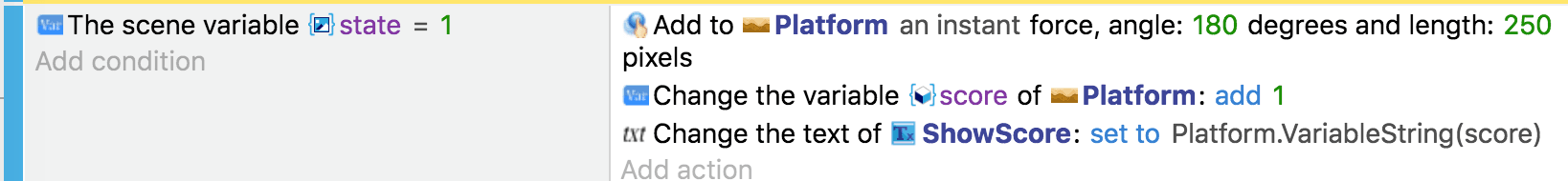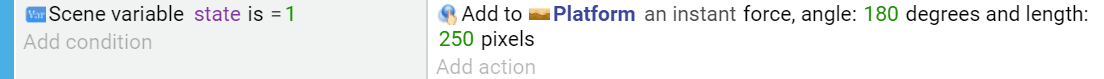 Hint: In the event where we specified a force for the Platform to move, we will now add a condition. Click Add a condition->Variables->Value of a scene variable. Set it to check if the value is equal to 1.tip