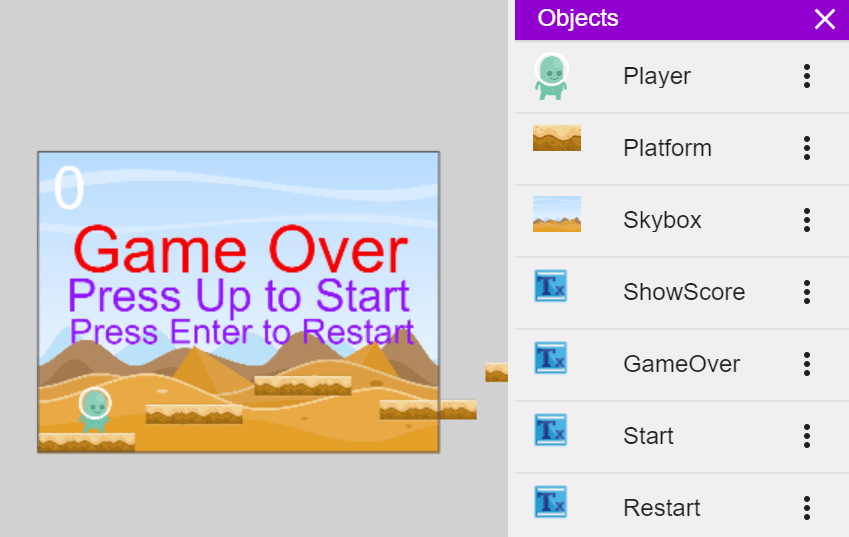 Now we will add other necessary text objects for our game like a Game Over Text, a Score text, a Press Enter to Restart and Press Up to Start. For each of them, we will be creating separate Text objects. Similar to our previous step, add new text objects and modify the text in the object editor. Simply drag and drop them to your scene space to display them.