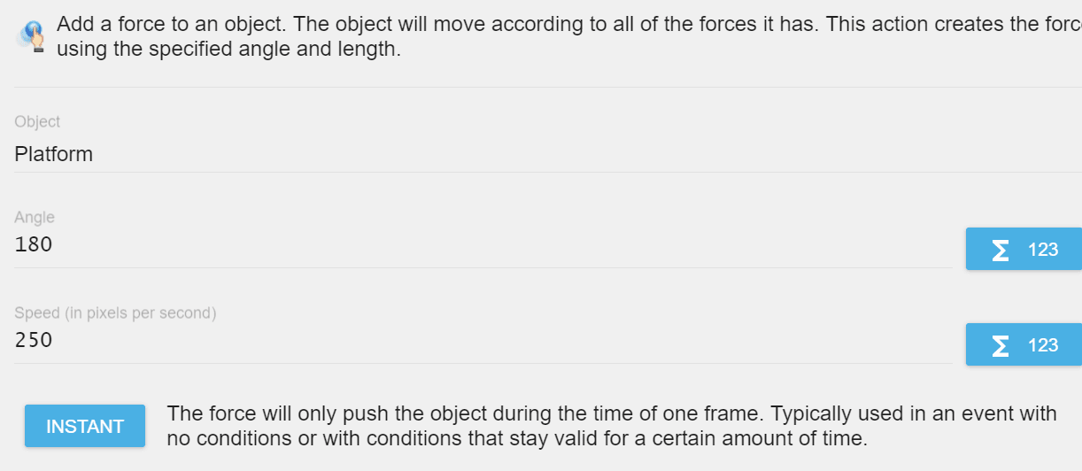 Now, we want to change the event: where we specified the value of the force with which the platforms move. Instead of specifying a value, we will use the scene variable speed. To use the scene variable there, we need to follow this syntax: Variable(speed), where speed is the scene variable specified.