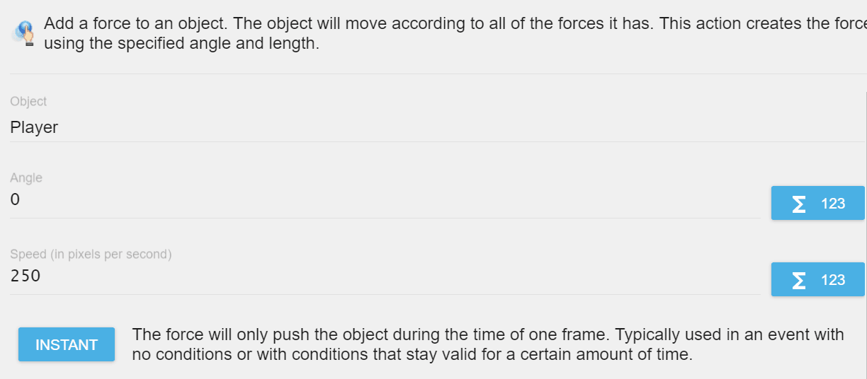 Hint: Click on Add an action. Find Common actions for all objects->Movement->Add a Force(Angle). Then choose Player as the object and assign it an angle 0(specifying right direction) and a speed 250.tip