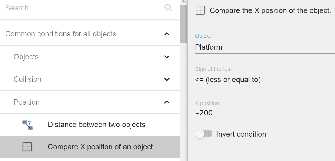 As you can see, the X position of the last tile is 1550 for me. Don't worry if it's different for you. Whatever be the value, we will use that value to make the platforms endless. Now, Add a condition for this new event. Find Common conditions for all object->Position->Compare X position of an object. Choose the object "Platform" with Modification sign ≤ (less or equal to) and value let's say -200.