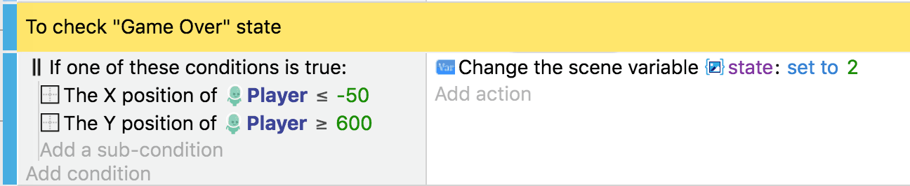 Now, let's understand what we did here. The condition we added specifies a rule such that if even one of the sub-conditions is true, then the action associated with this event will be executed. Since the game ends if he falls down (Y position) or gets pushed outside the screen(X position), so we check for the X position and the Y position.