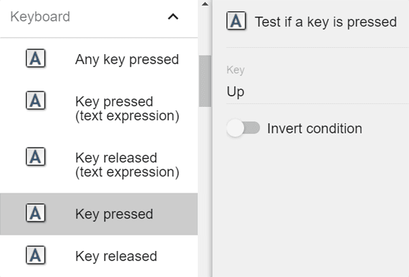 For our first event, we want our Player Sprite to Jump when the Up arrow key is pressed. To do that, we need to add a condition to detect whether the Up key is pressed or not. Click on Add a condition and search for the "Keyboard" category. Choose Key pressed condition and make it check the Up key as shown below.