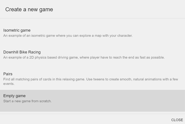 Once on the Start screen, click on the "Create a New Project" button. By doing so, a "Create a New Game" dialog box appears. Next, scroll down and find the "Empty Game" tab. Click on it to open a new project.