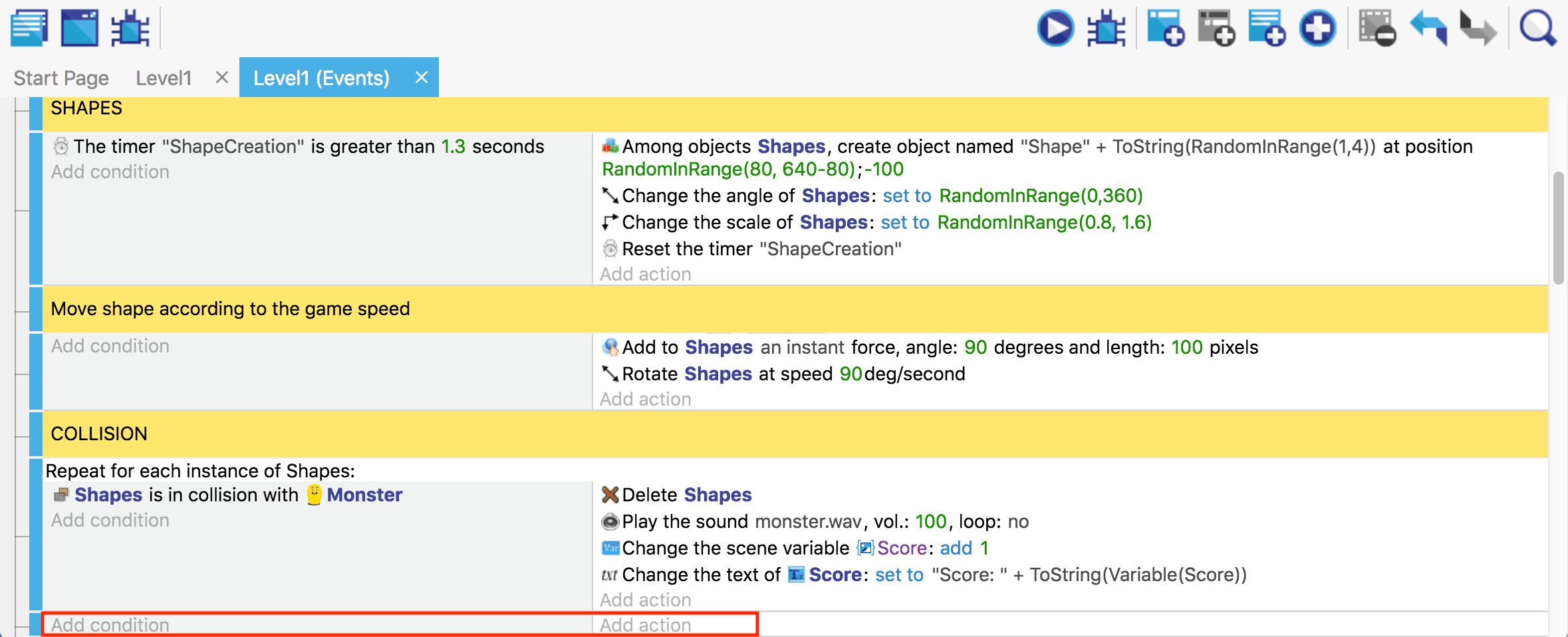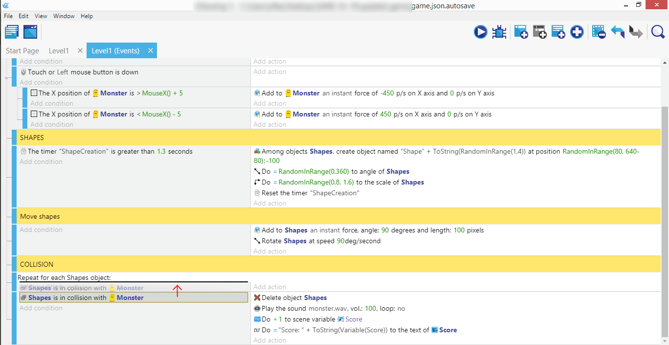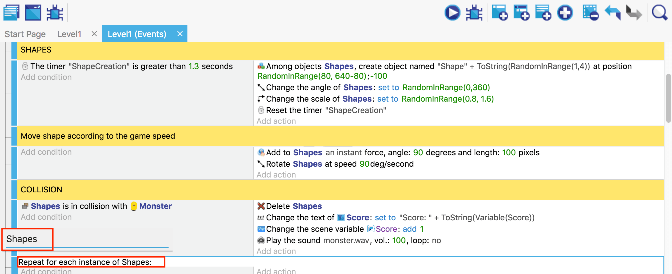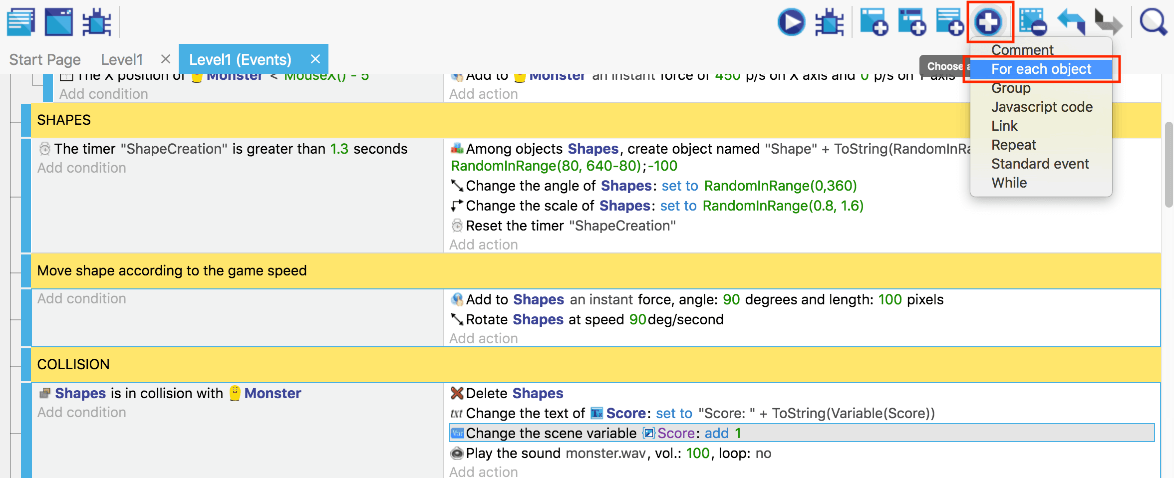 This is in fact a bit incomplete: in case we're collecting two shapes at the very same time, we'll only get one point! This is because the condition will be considered "true" for both shapes that are colliding with the monster, but the action is then only run once. We'll fix that in a few moments with a "For Each" event.