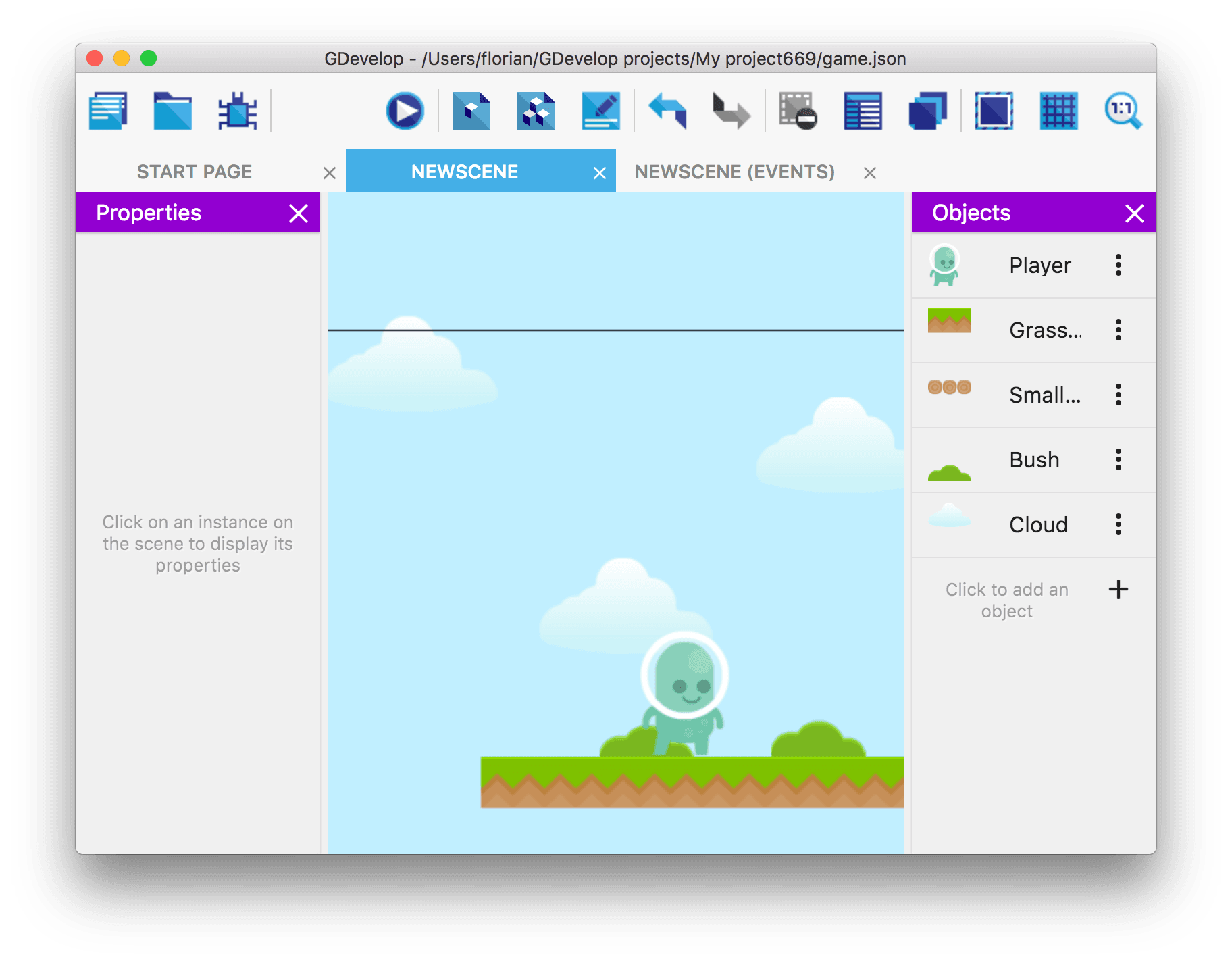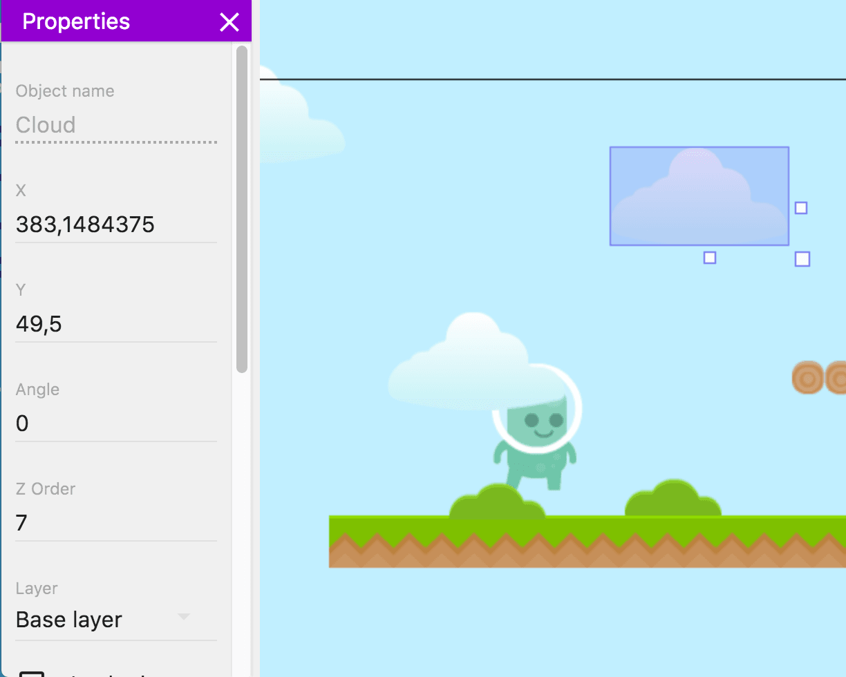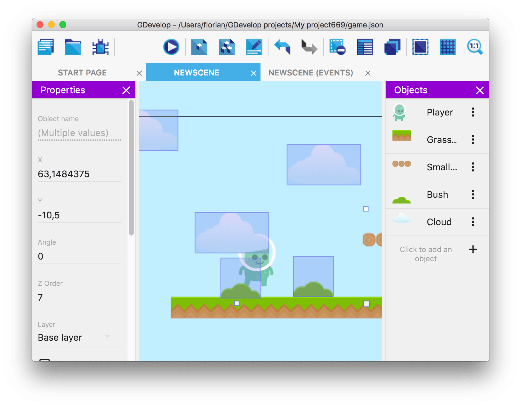 Here, you can change the Z-order of bushes and clouds to set them negative, so that the player character (with a Z-order that should be 1) is displayed in front of them. To do this, select the instances on the scene. You can keep pressing SHIFT on your keyboard to select more than one object: