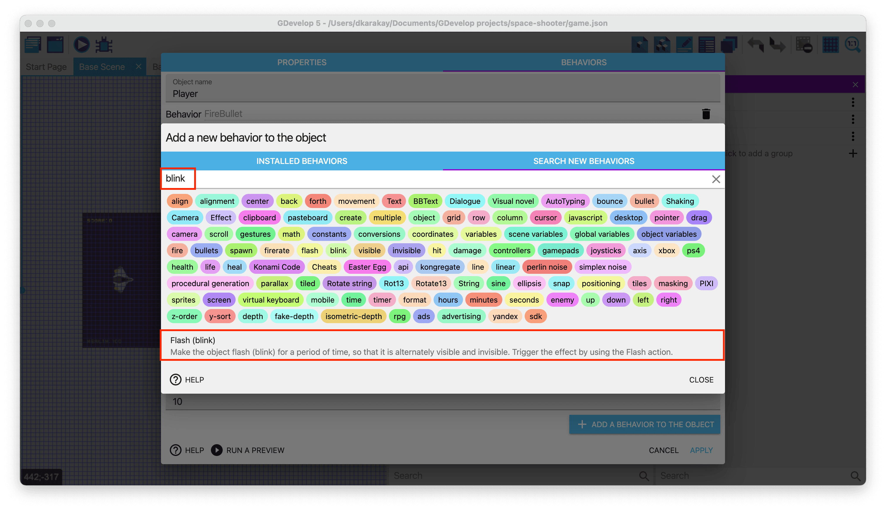 We will use a blinking effect for the player when the player gets damaged. In GDevelop, there is a behavior for blinking, so go to the player's behavior settings. Then search "blink" to install the action called Flash.